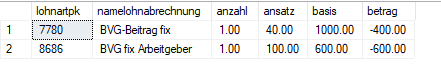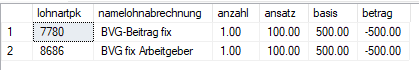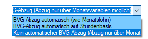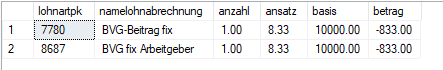 Als dritte Möglichkeit können Sie mit der Lohnart 7780 auch den prozentualen Abzug des BVG abbilden. Dabei wird dann die Lohnart 8687 verwendet, da sich die Berechnungsgrundlagen unterscheiden. Bei dieser Lohnart wird für AN und AG immer derselbe Abzug angewendet.