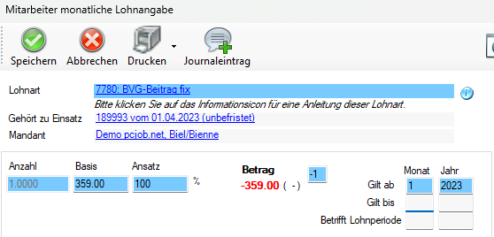 Erfassen Sie den vom Versicherer gemeldeten Beitrag in den monatlichen Lohnangaben mit der Lohnart 7780 BVG Beitrag fix