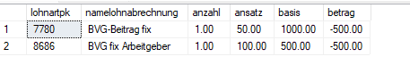 Dabei wird die Lohnart 8686 BVG Fix Arbeitgeber (bzw. 8687, s.u.) automatisch berechnet. Aus technischen Gründen wird dabei mit Ansatz 100 und der berechneten Basis der korrekte Betrag erfasst. Als nicht sichtbare Arbeitgeberlohnart benötigen wir für die BVG Abrechnungen nur die Basis und den Betrag.