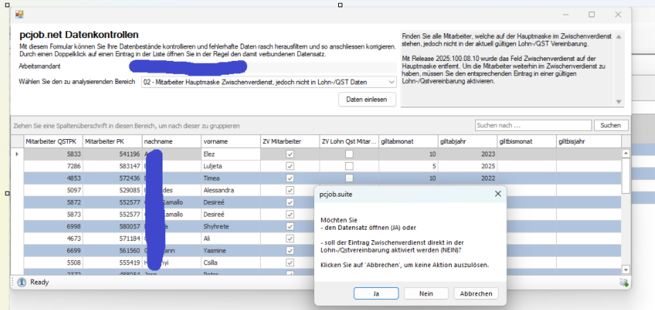 Klicken Sie "JA", um den Mitarbeiterdatensatz zu öffenen.