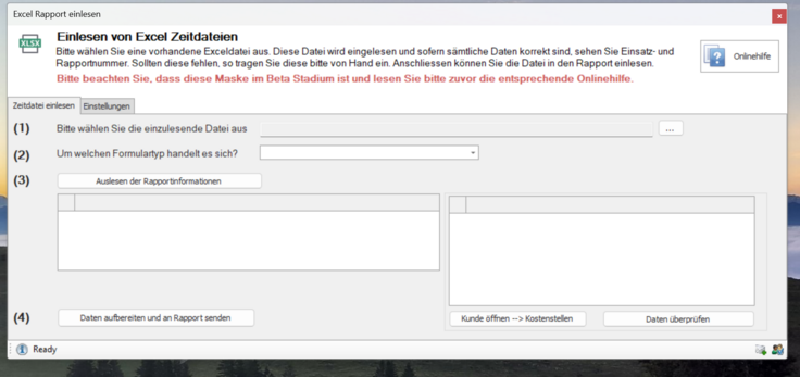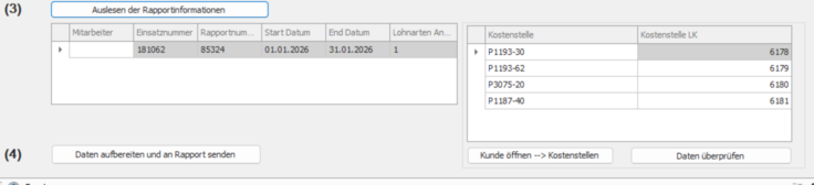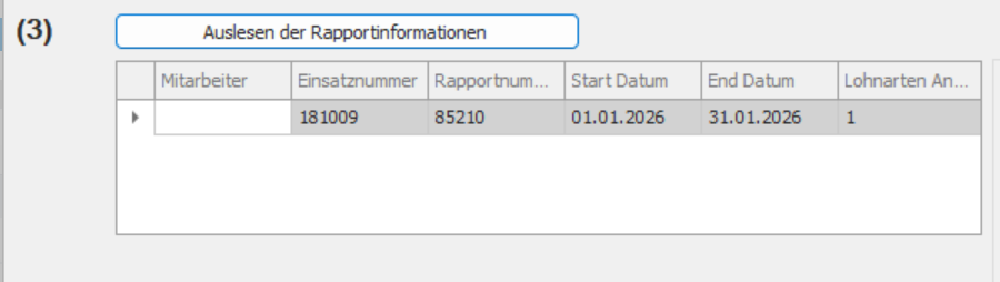 Mit dem korrekten Formulartyp kann die Exceldatei nun durch einen Klick auf "Auslesen der Rapportinformation" in eine interne Datenstruktur ausgelesen werden. Nach erfolgreichem Einlesen erscheinen sämtliche notwendigen Informationen in der Tabelle. Bitte kontrollieren Sie die Einsatz- und die Rapportnummer, da diese für die anschliessende Verarbeitung essentiell sind.