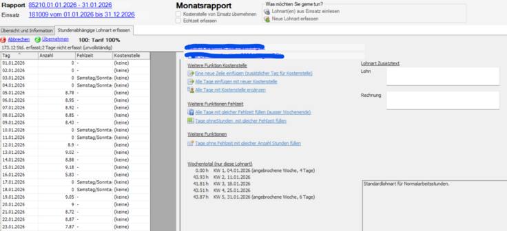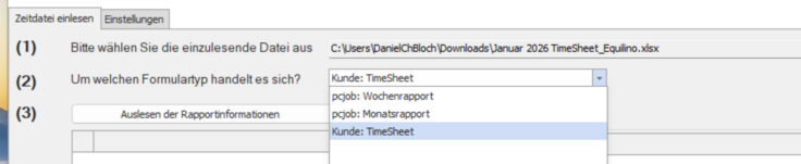Mit Version 2026.100.02.10 haben wir eine Beta Version der Funktionalität ausgeliefert. Die bisherigen, eigenen Excel Dateien (Wochenrapport, Monatsrapport) funktionieren nach wie vor, zusätzlich haben wir eine erste kundenspezifische Datei (TimeSheet) implementiert.
