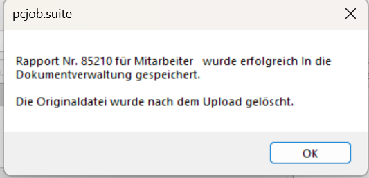 Die Zeitdatei kann mit dem oberen Schalter direkt in die Dokumentverwaltung von pcjob.net hochgeladen werden. Der Rapport wird dann unter dem Einsatz in die Dokumente gespeichert und bleibt somit archiviert.
